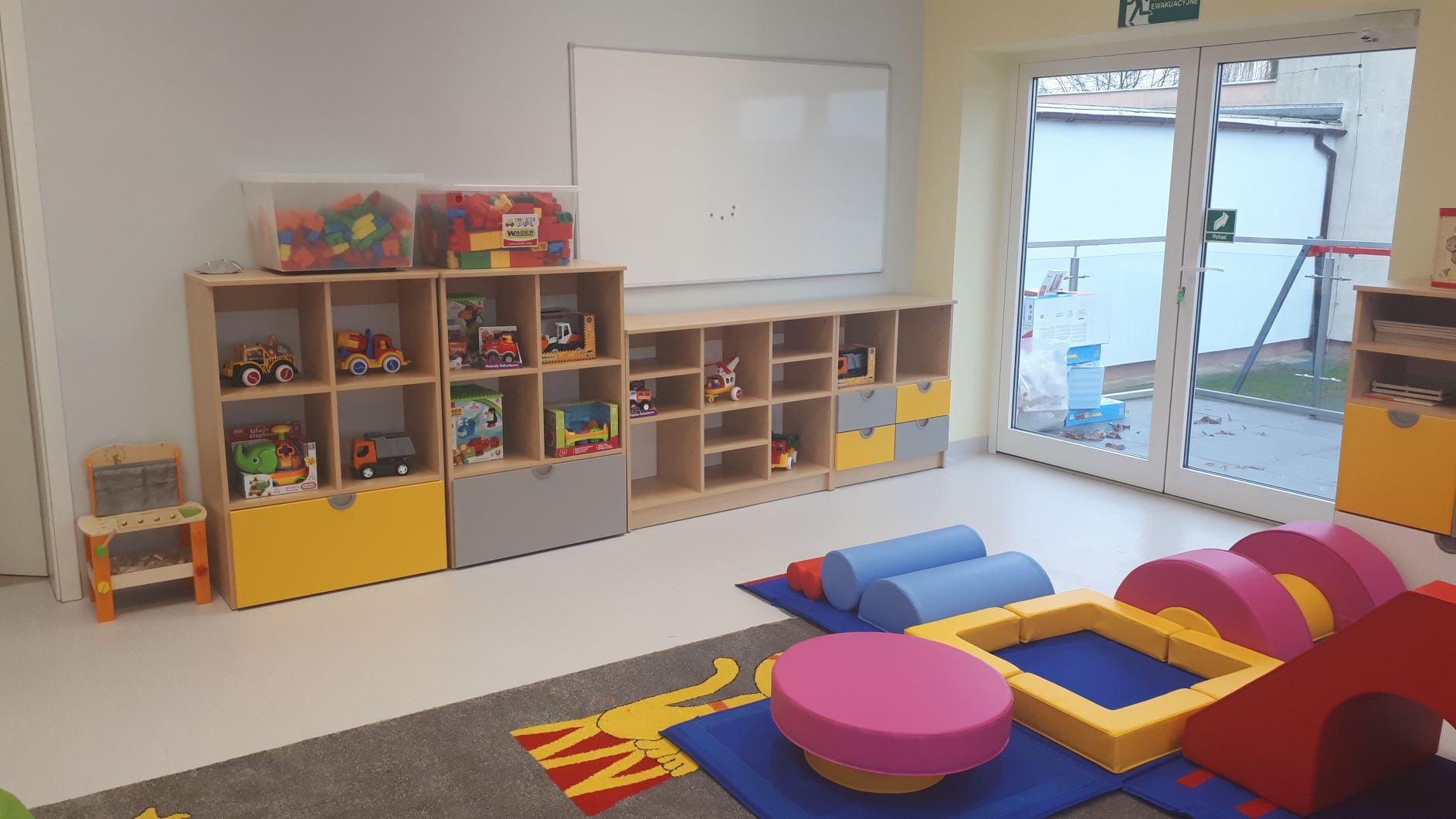 Natomiast z sali zabaw poprzez taras można bezpośrednio wyjść na plac zabaw, który jest ogrodzony i dostosowany do potrzeb dzieci do 3. roku życia.