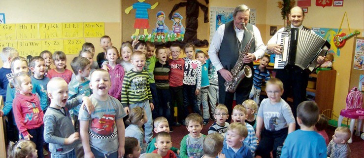 W przedszkolu w Taczanowie Drugim gościł dziadek Nikodema z grupy czterolatków - Kazimierz Pietrzak, który gra na saksofonie. Razem z nim przybył także Tadeusz Stańczyk – akordeonista. Obaj panowie są muzykami z zamiłowania. Gry na instrumentach nauczyli się sami. W czasie wizyty gości przedszkolaki poznały brzmienie i wygląd saksofonu oraz akordeonu. Panowie zaprezentowali kilka utworów z repertuaru muzyki ludowej oraz biesiadnej. W czasie koncertu nogi same rwały się do tańca, a ręce - do klaskania. Na koniec wszyscy razem próbowali zaśpiewać piosenkę „Pieski małe dwa” z towarzyszeniem akompaniujących gości.