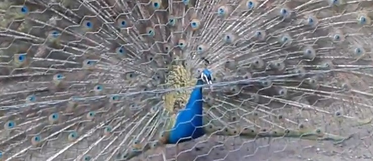Wiosna wszędzie. "Pobudziły" się do życia także pawie mieszkające w gołuchowskim parku. Tak swoje wdzięki zaprezentował jedyny w zagrodzie samiec pawia.