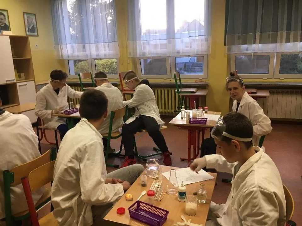 Nocne warsztaty dla uczniów siódmej i ósmej klasy Szkoły Podstawowej w Lutyni rozpoczęły się od doświadczeń chemicznych. Młodzież w dwóch zespołach pod czujnym okiem Izabeli Jędrzejak i Hanny Jopek przeprowadzała efektowne eksperymenty spalania węglowodorów w przygotowanym, bezpiecznym środowisku.