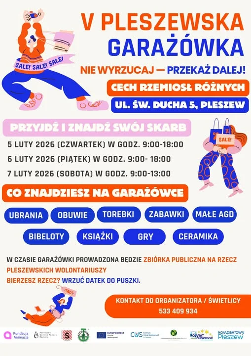 Od czwartku do soboty potrwa kolejna, już piąta edycja Pleszewskiej Garażówki. Każdy może przyjść i wybrać coś ciekawego dla siebie! Do wyboru: ubrania, obuwie, torebki, zabawy i gry, książki, płyty, dekoracje do domu, małe AGD i wiele innych. Wszystko dostępne jest w budynku Cech Rzemiosł Różnych (ul. Świętego Ducha 5) Zebrane pieniądze przeznaczone zostaną na wsparcie wolontariuszy.