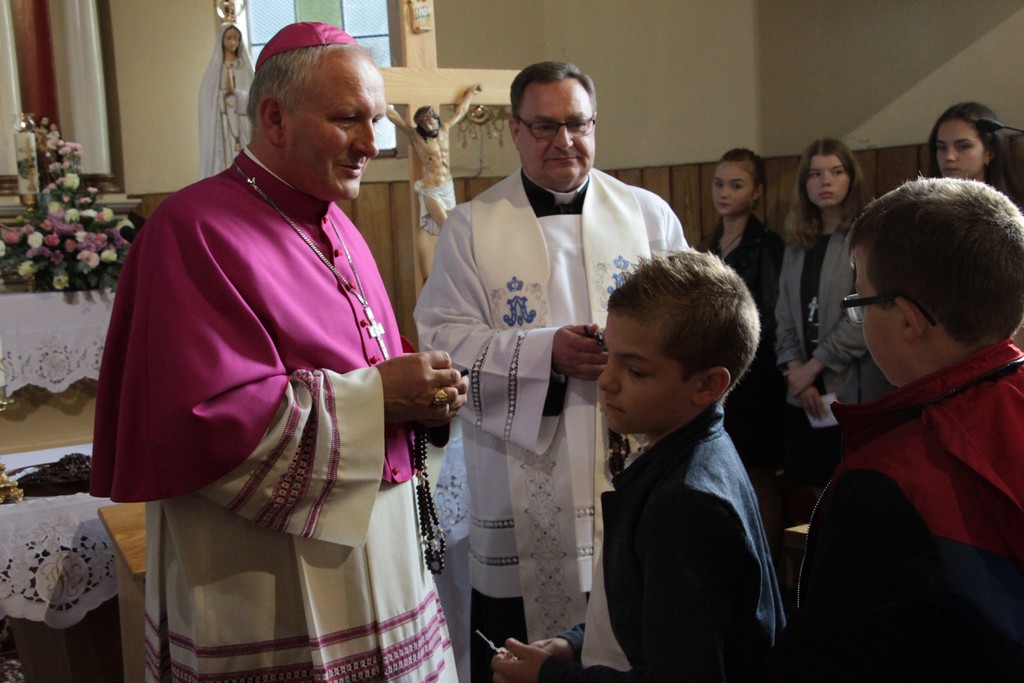 Przed główną uroczystością bierzmowania - poświęcone zostały ponadto różańce (ufundowane przez miejscową radną Wiesławę Gil), które następnie zostały rozdane: zarówno dzieciom przystępującym do I Komunii Świętej (osobiście wręczał je biskup) i młodzieży, która przystępowała tego dnia do bierzmowania.