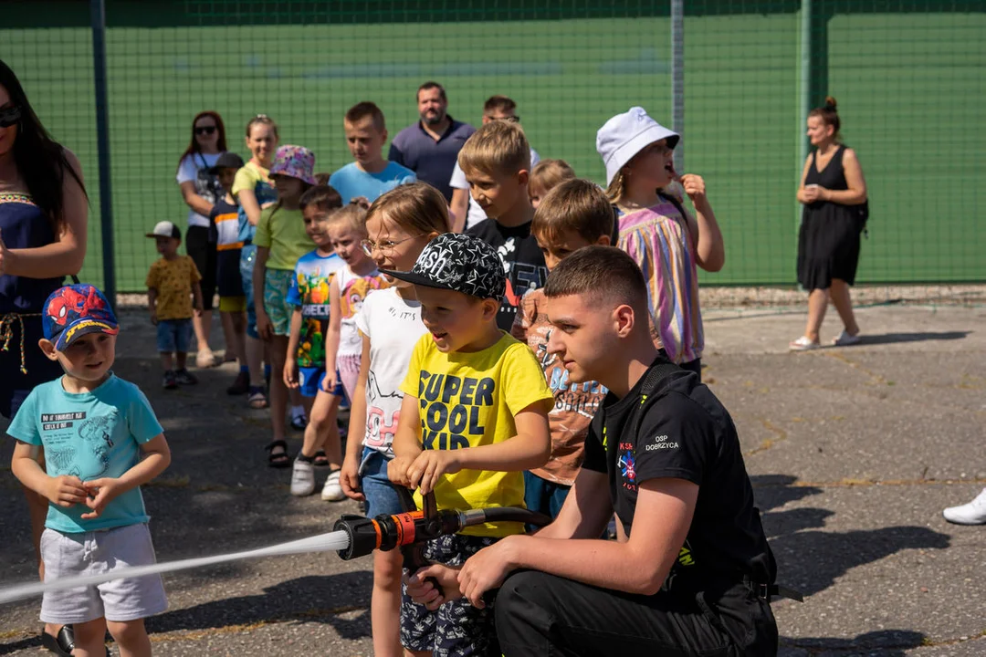 Nie zabrakło pokazu strażaków z OSP Dobrzyca. Furorę zrobił pokaz ich sprzętu. Przedszkole odwiedzili też policjanci. Mundurowi nie tylko zaprezentowali radiowóz, ale też przybliżyli najmłodszym i ich rodzicom tematykę związaną z włamaniami do domów w trakcie wakacji.
