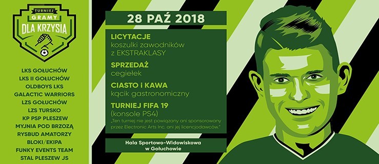 Już w tę niedzielę 28 października odbędzie się charytatywny mecz w gołuchowskiej hali. W przerwie rozgrywek, około godz. 16.00, odbędzie się licytacja, z której dochód zostanie przekazany na potrzeby leczenia Krzyśka. Do kupienia - liczne gadżety: koszulki rozmaitych zespołów sportowych, także z podpisami zawodników, piłki, indywidualny trening czy wyjazd do Zakopanego.