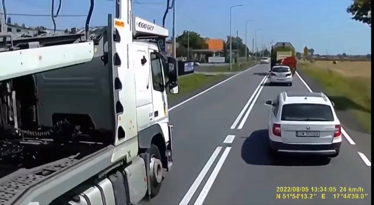A gdyby tego było mało, dwa auta osobowe jadące z naprzeciwka musiały zjechać na pobocze (w bliskiej odległości głębokiego rowu), by kierowca tira się zmieścił. Przyczepa mija auta dosłownie na centymetry...
