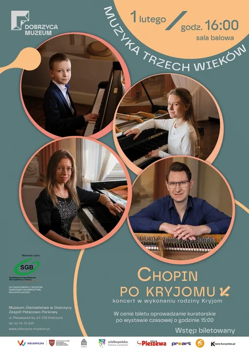 Już 1 lutego w sal balowej pałacu publiczność będzie mogła wysłuchać koncertu ,,Koncertowanie po Kryjomu’’ w wykonaniu utalentowanej rodziny Kryjom. Wybrzmią utwory Jana Sebastiana Bacha, Henryka Bertiniego i Fryderyka Chopina.
