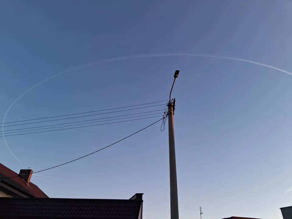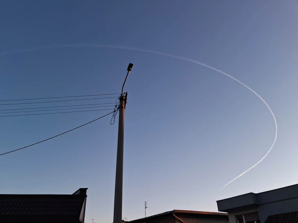 Manewr zawracania (wykonania pętli o 180 stopni) nastąpił akurat nad naszym regionem. Na dużej wysokości smuga kondensacyjna precyzyjnie odwzorowała zmianę kursu maszyny, tworząc na niebie biały łuk.