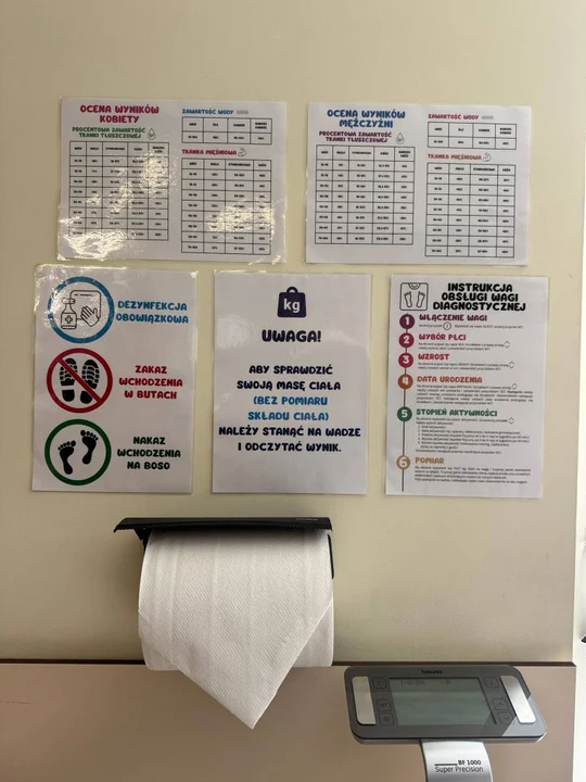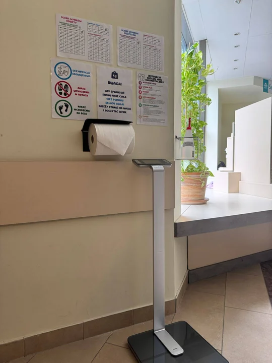 - Higiena to podstawa: przed każdym użyciem należy zdezynfekować powierzchnię wagi. Płyn do dezynfekcji oraz papierowe ręczniki znajdują się w wyznaczonym miejscu tuż obok urządzenia.