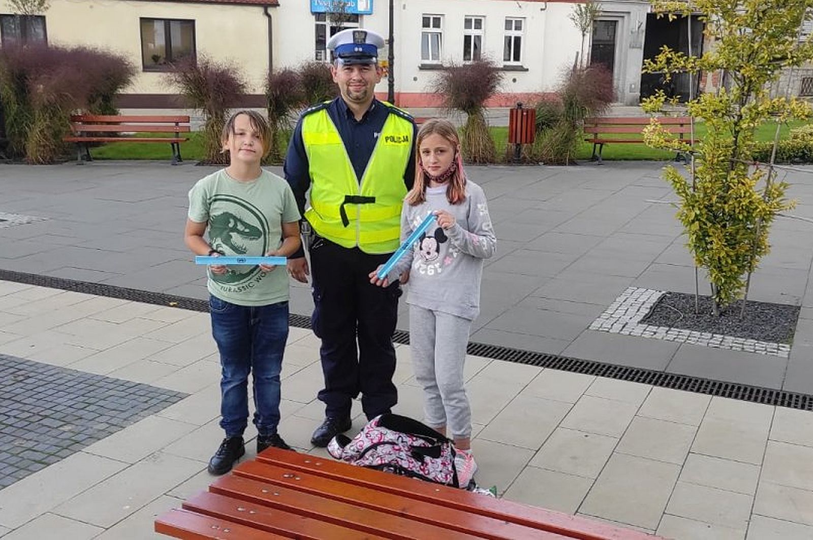 Policjanci z Wydziału Ruchu Drogowego pleszewskiej komendy rozdawali mieszkańcom opaski odblaskowe w ramach akcji prewencyjnej - związanej z bezpieczeństwem w ruchu drogowym oraz w związku z rozpoczęciem szkoły.