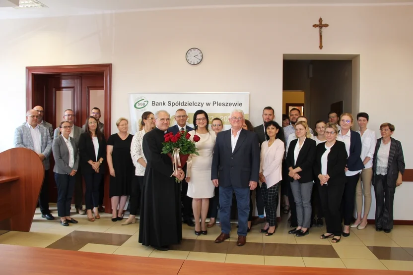 Ksiądz prałat Henryk Szymiec - wieloletni proboszcz parafii pw. Ścięcia św. Jana Chrzciciela w Pleszewie - odchodzi na emeryturę. Przez ponad 30 lat pełnił również funkcję duszpasterza bankowców w diecezji kaliskiej. Dlatego w Banku Spółdzielczym w Pleszewie odbyło się uroczyste spotkanie, na którym pożegnano duchownego i podziękowano mu za jego posługę.