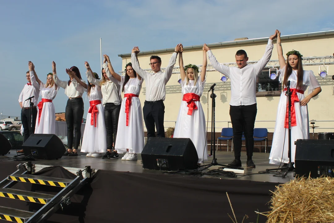 Tradycyjny obrzęd przedstawił zespół "Błękitne Modraczki". Chleb dożynkowy na ręce burmistrza Jarosława Pietrzaka i przewodniczącego miejscowej rady Witalisa Półrolniczaka przekazali starostowie: Klaudia Marzyńska i Marcin Sobczyński.