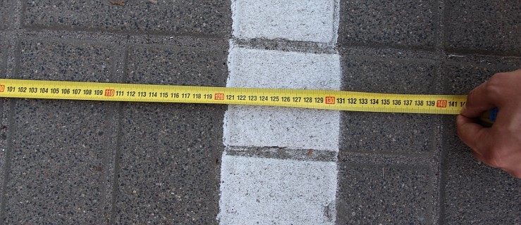 Tymczasem powstał nowy problem. Wyrysowana strefa jest szersza od dotychczasowych miejsc parkingowych, oznaczonych ciemniejszą kostką chodnikową. Tak jest choćby na ul. Kaliskiej. Zgodnie z Prawem o ruchu drogowym, szerokość chodnika pozostawionego dla pieszego nie może być mniejsza niż 1,5 m. W kliku miejscach na Kaliskiej jest 1,20-1,30 m.