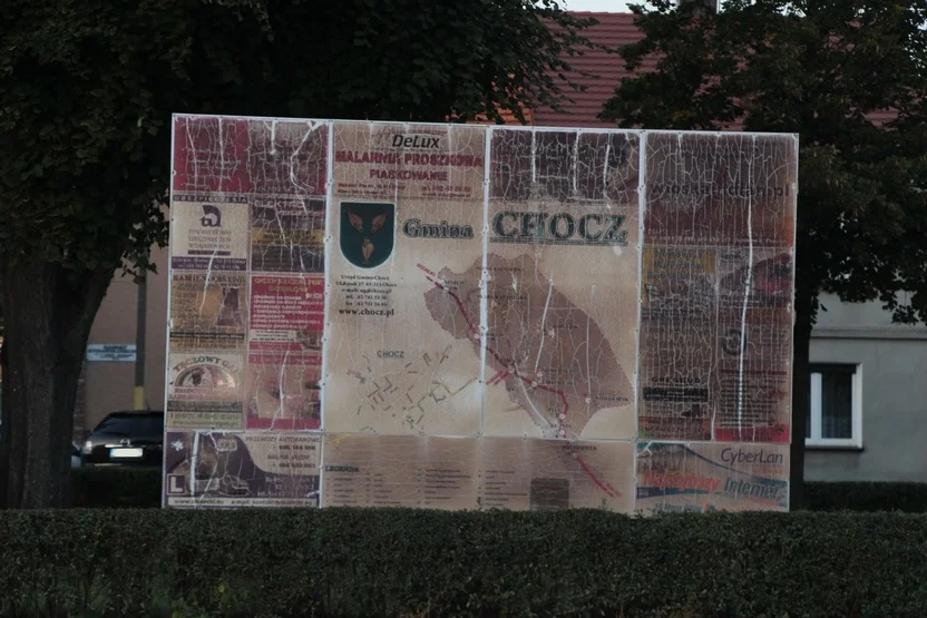 Na rynku w Choczu znajduje się tablica reklamowo-promocyjna. Umieszczono ją tam w celu zaprezentowania przedsiębiorców działających w gminie i okolicy. Rzeczywiście, można znaleźć na niej numery telefonów do miejscowych firm, ale wielu zastanawia się - czy są one aktualne? Tablica stoi bowiem w centrum miasta już od kilku lat, co zdradza jej obecny stan. Z biegiem czasu - plansza zaczęła niszczeć i dzisiaj nie wygląda atrakcyjnie.
