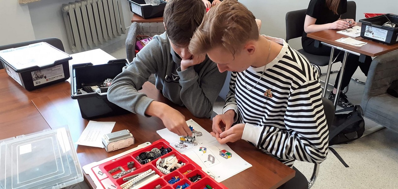 Uczniowie klasy pierwszej NLO w Pleszewie w ramach zajęć informatycznych pod okiem Mirelli Robakowskiej z ochotą przystąpili do budowania pierwszych robotów.