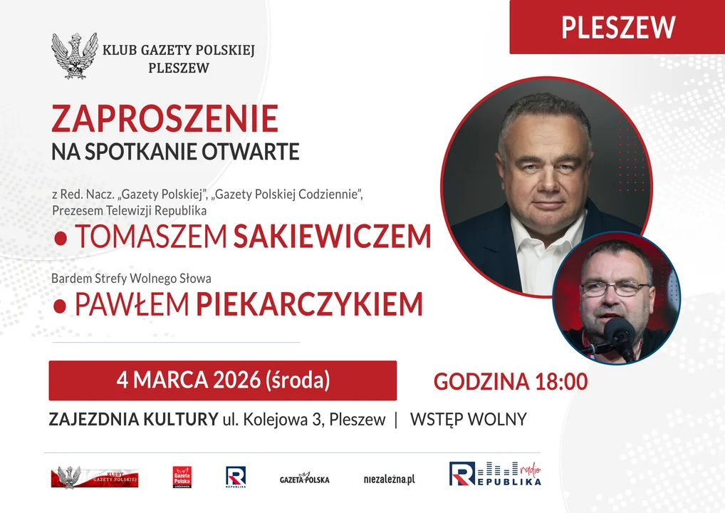 Pleszewski Klub Gazety Polskiej organizuje otwarte spotkanie z Tomaszem Sakiewiczem, prezesem Telewizji Republika, a także artystą wykonującym poezję śpiewaną Pawłem Piekarczykiem.