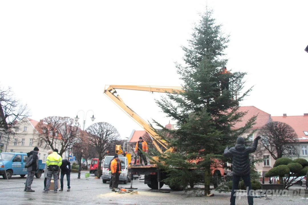 Na rynku w Pleszewie rozpoczął się dziś montaż świątecznych iluminacji. Przyjechała także choinka, która już stanęła na rynku.