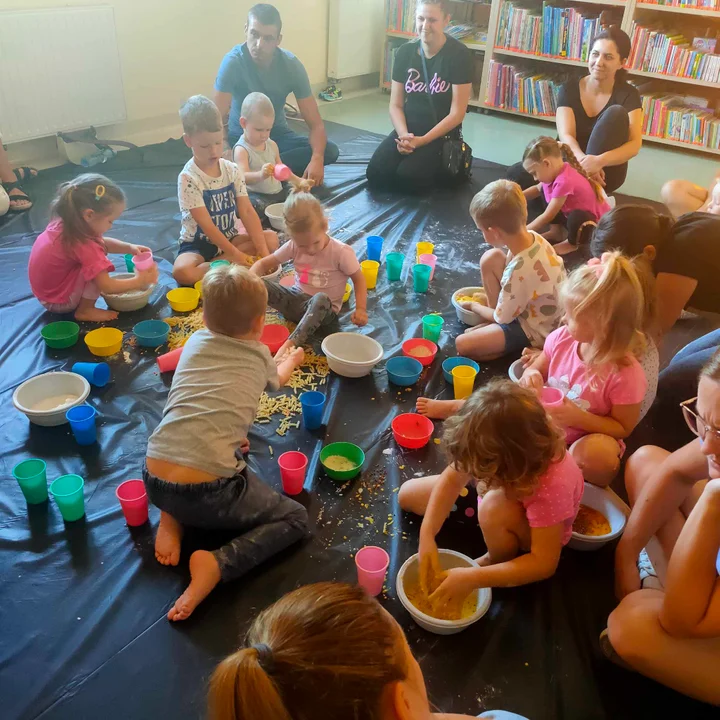 Podczas zajęć plastyczno-ruchowych, oddziałujących na zmysły i stymulujących m.in. rozwój motoryki małej i dużej, sfery poznawczej, społecznej oraz rozwój mowy, dzieci samodzielnie odkrywały, co powstaje z połączenia mąki i wody, tworzyły ścieżkę sensoryczną, po której chodziły, bawiły się zabawkami sensorycznymi zakupionymi przez bibliotekę oraz przeglądały książeczki sensoryczne.